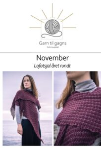 Det særegne i november i Lofoten er lyset som stadig skifter. Dette har jeg forsøkt å fange opp i fargevalg i sjalet, jeg har strikket det i forskjellige blå/lilla - varianter i håndfarget garn og garn fra Hillesvåg ullvarefabrikk. Jeg har også hentet inspirasjon til modellen i et gammelt sjal fra Akershus som jeg har rekonstruert. Dette er et sjal med V-form som kan bindes rundt hele kroppen, jeg har kalt sjalet en "sjelevarmer", - et vakkert navn på sjal som jeg har hentet fra Grytøy i Troms.