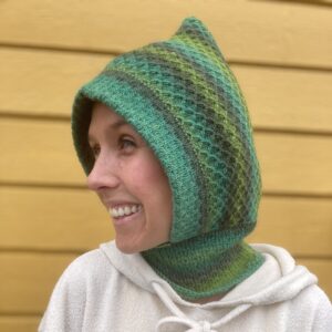 Sjalet på modellen er strikket i Drops alpakka silk, men jeg strikker den også i Hillesvåg ull "Huldra"