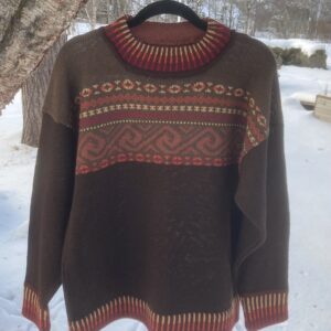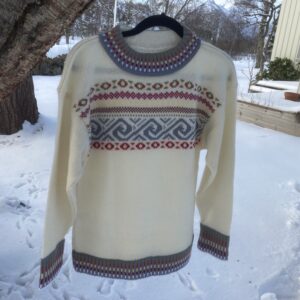 "Færing" er genseren som har fått navnet etter den mest brukte robåten langs kysten vår. Færing var den minste av de tradisjonelle fiskebåtene.Den var lett å manøvrere, genseren med samme navn er også lett og bruksvennlig, og designet for å kunne benyttes ved alle anledninger. . Den er strikket i garn fra Hillesvåg ullvarefabrikk eller Drops alpaca pris kr. 2.450,-